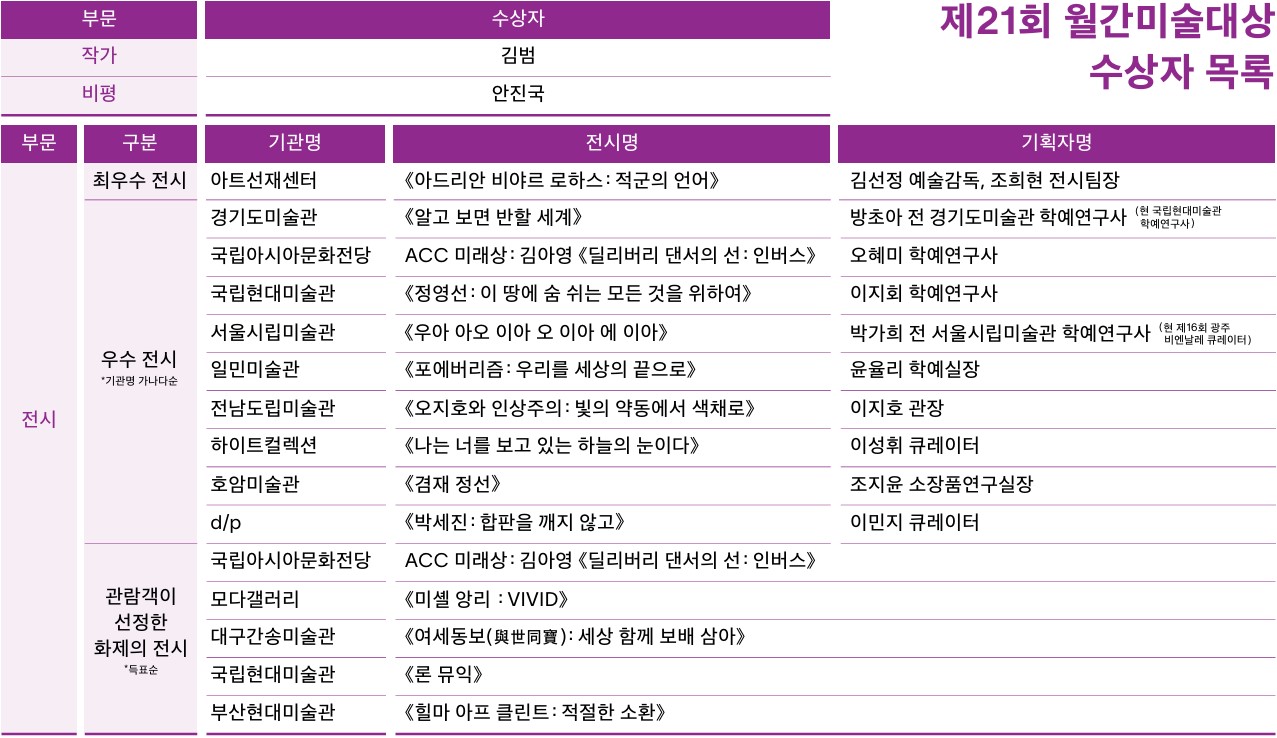 월간미술(대표 이기영)은 2025년 12월 1일 성곡미술관에서 열린 제21회 월간미술대상 시상식에서 작가 부문에 김범, 비평 부문에 안진국, 전시 부문 최우수 전시로 아트선재센터 《아드리안 비야르 로하스: 적군의 언어》 (2025)를 비롯한 우수 전시 10개를 시상했다. 아울러 ‘널 위한 문화예술’ 과 협업해 ‘관람객이 선정한 화제의 전시’ 부문을 신설하고, 국립아시아 문화전당의 ‘ACC 미래상: 김아영 《딜리버리 댄서의 선: 인버스》’(2024) 등 ‘Top 5’ 전시를 함께 호명했다. 새해 『월간미술』 창간 50주년을 앞두고 시상 시기와 심의 기준을 재정비하는 한편, 전문가 심사와 관람객 참여를 병행하는 구조를 도입한 점이 이번 시상식의 주요 변화다.