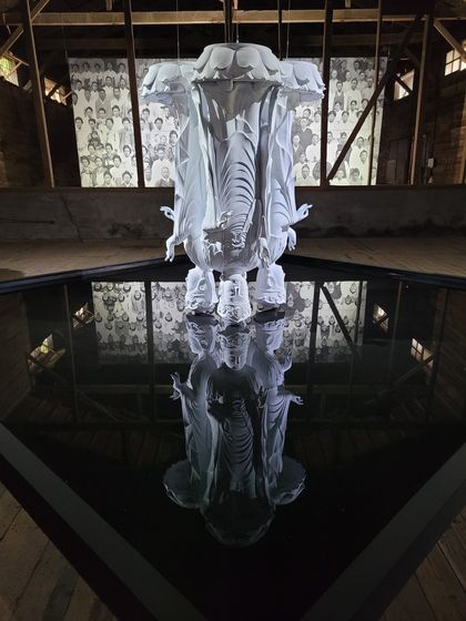 가장 시각적으로 강렬한 것은 공장의 어두운 공간에 4개의 하얀 백제 관음보살상이 천정으로부터 거꾸로 매달려 있는 작품이다. 언뜻 불경스러운 작품으로 보일 수도 있으나 보살상 아래에 펼쳐진 수조를 보면 생각이 달라진다. 이 수조는 보살상을 선명하게 반영하는데 그 반영에서 보살상들은 바로 서 있을 뿐만 아니라 마치 광대무변의 검은 우주 공간을 유영하며 무한한 자비를 펼치는 것으로 보인다.