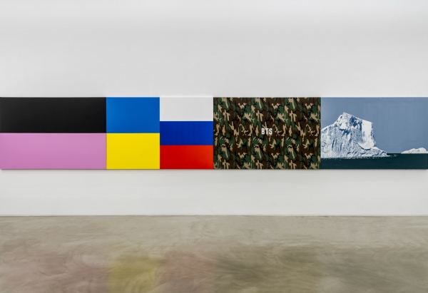 블랙과 핑크로 된 긴 직사각형, 파랑과 노랑의 짧은 사각형, 흰색과 파랑과 빨강으로 3단 구성된 사각형, ‘BTS’ 글자가 써진 군복 무늬 천, 바다 위 빙산 풍경. 눈앞에 이렇게 다섯 개 화면이 가로 775.6cm 크기로, 한 치의 틈 없이, 줄줄이 붙어있는 미술작품이 있다. 자, 여러분이라면 이 작품을 어떻게 감상할 것인가? 다양한 색 면이 연속한 만큼 미니멀리즘 스타일이 보인다. 군복 패턴은 얼핏 미국 추상표현주의 화가 클리포드 스틸Clyfford Still의 그림 같기도 하다. 거대한 빙하의 대자연은 19세기 독일 낭만주의 화가 카스파르 다비트 프리드리히Caspar David Friedrich의 ‘숭고회화’ 계열로 볼 수 있을까.
