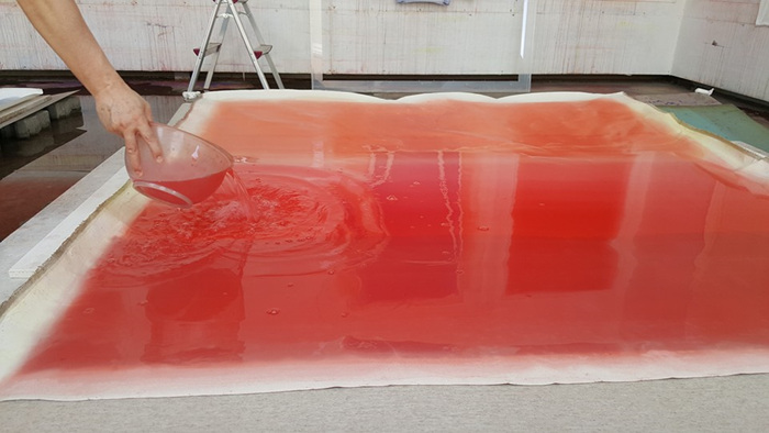 어느 누구도 완전히 예측할 수 없고 분석할 수 없는 일회적(一回的) 조건이 작업실에 초대되어 예술 창작에 흔적을 남긴다. 캔버스에 보이는 색깔은 거의 물에 가까운, 미세한 차이를 가진 색들의 층(層)이 모여서 만든 색이지만 놀라울 정도로 얇고 은은하다. 자세히 보면 손으로 조절하지 않고 자연스럽게 형성된 물길의 흔적과 선(線), 기계적이지 않고 불규칙적으로 만들어진 농담, 때론 극소하게 박힌 점들, 혹은 비단의 얼 같은 자연스러운 흠이 있다. 이러한 요소들은 자연스럽게 어우러지며 은은하게 묻혀 있다.