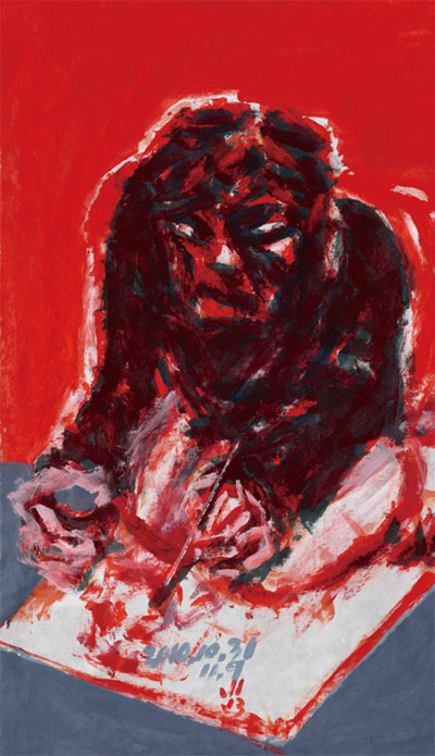 무릎을 꿇고 수행하듯이 그림을 그리고 있다. 매우 전투적인 그리기 자세이며 진지한 성찰과 집요함이 느껴진다.