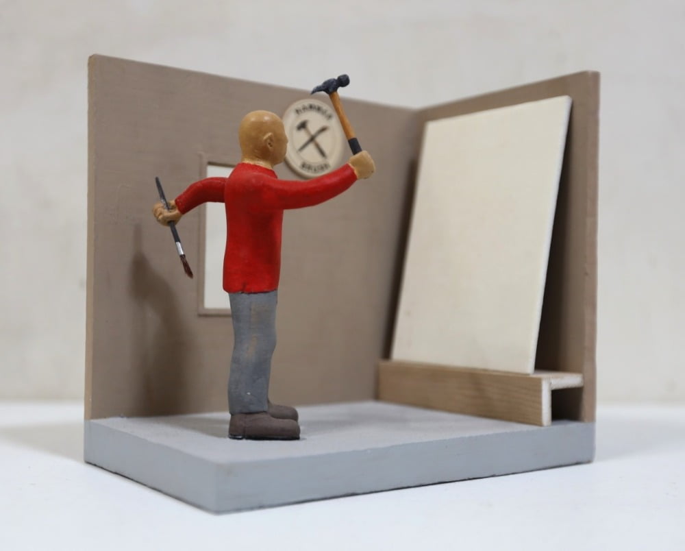 흰 캔버스를 앞에 두고 붓을 들어 체조를 하기도 하고 망치로 부수어 버리는 제스쳐를 하기도 한다. 한 손에는 붓을 다른 한 손에는 망치를 들고