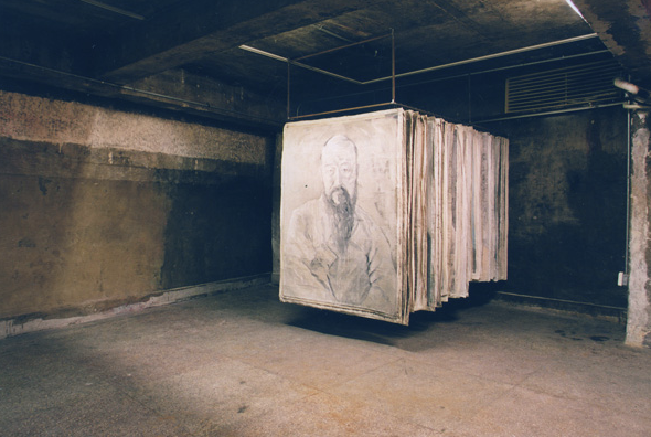 ‘혈류도’ 연작은 5대에 걸친 가족들의 초상, 종가집, 선산, 토지, 지적도, 혈류도, 지도그림 등으로 구성되어 있다. 이번 전시에서는 조상들이 묻혀 있는 선산 풍경과 그 선조들의 초상이 포함된 31점의 인물도가 서로 마주하도록 캔버스와 판넬 작품들을 설치하였다. 두 작품 사이의 간격은 수많은 세월과 사연이 복잡하게 얽혀져 있는 의미망이다.