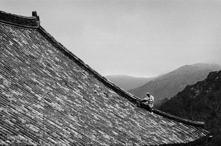 그날, 가야산과 해인사는 인산인해였고 다비식은 엄숙하게 진행됐다. 많은 사진가들이 행사의 이모저모, 한 장면도 놓칠세라 진행에 관심을 집중했다. 그러나 정작 작가는 큰스님이 남긴 기운을 하늘과 바람과 나무에서 보았다. 사찰을 감싸고 도는 형용 불가능한 에너지를 지붕 위 한 스님의 조용한 묵상에서 읽었다. 침묵이었으나 해탈의 연장이었고, 큰스님의 맑고 진한 향기가 다비의 불과 연기를 따라 가야산 골골이 흩어짐을 배웅하는 것이었다. 이갑철은 이 순간을 직감적으로 카메라에 옮겼다. 생사의 궁극을 자연의 일부로 관조하면서 한국인의 문화적 전통과 정서 뒤에 놓인 아련함과 아릿함을 적막과 고요로 담아냈다.