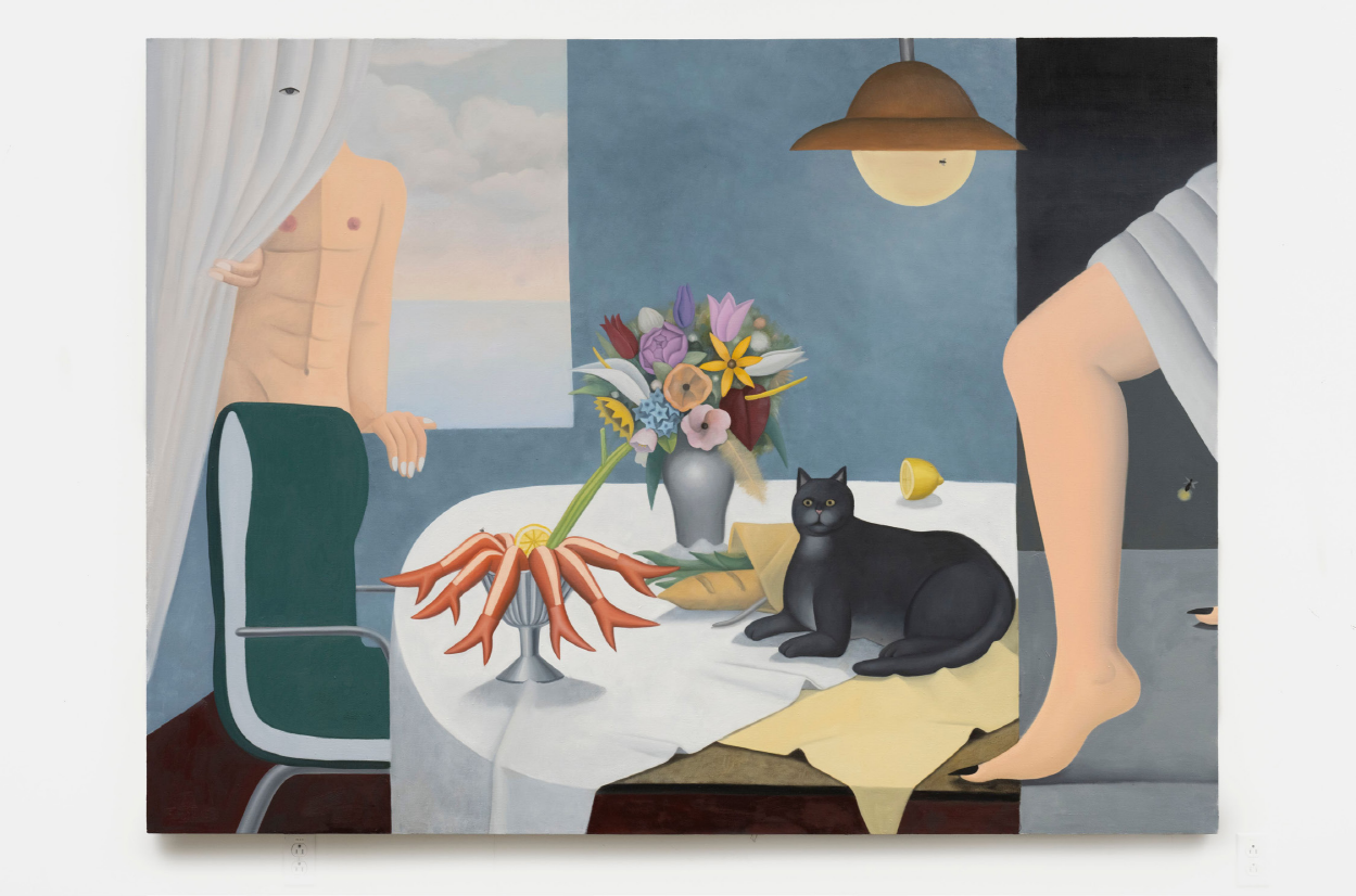 옆에는 빵 한 덩이, 무표정한 검은 고양이, 레몬, 그리고 다리를 높이 올리고 춤추는 쇼걸들의 발을 연상시키는 새우 꼬리들이 배열되어 있다. 왼쪽에서는 얼굴 없는 맨몸의 남성이 창문을 통해 들어오며 커튼을 밀어젖힌다.