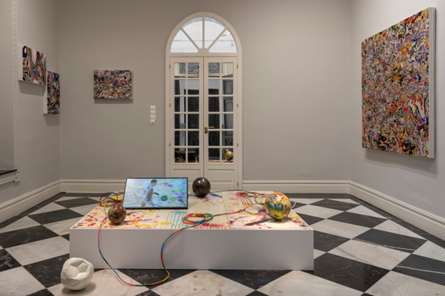 Installation view of 《Abstract, Poetry Weapon / Soccer Paintings by soccer ball bouncing over Crocodile River》 © Carlier Gebauer Gallery