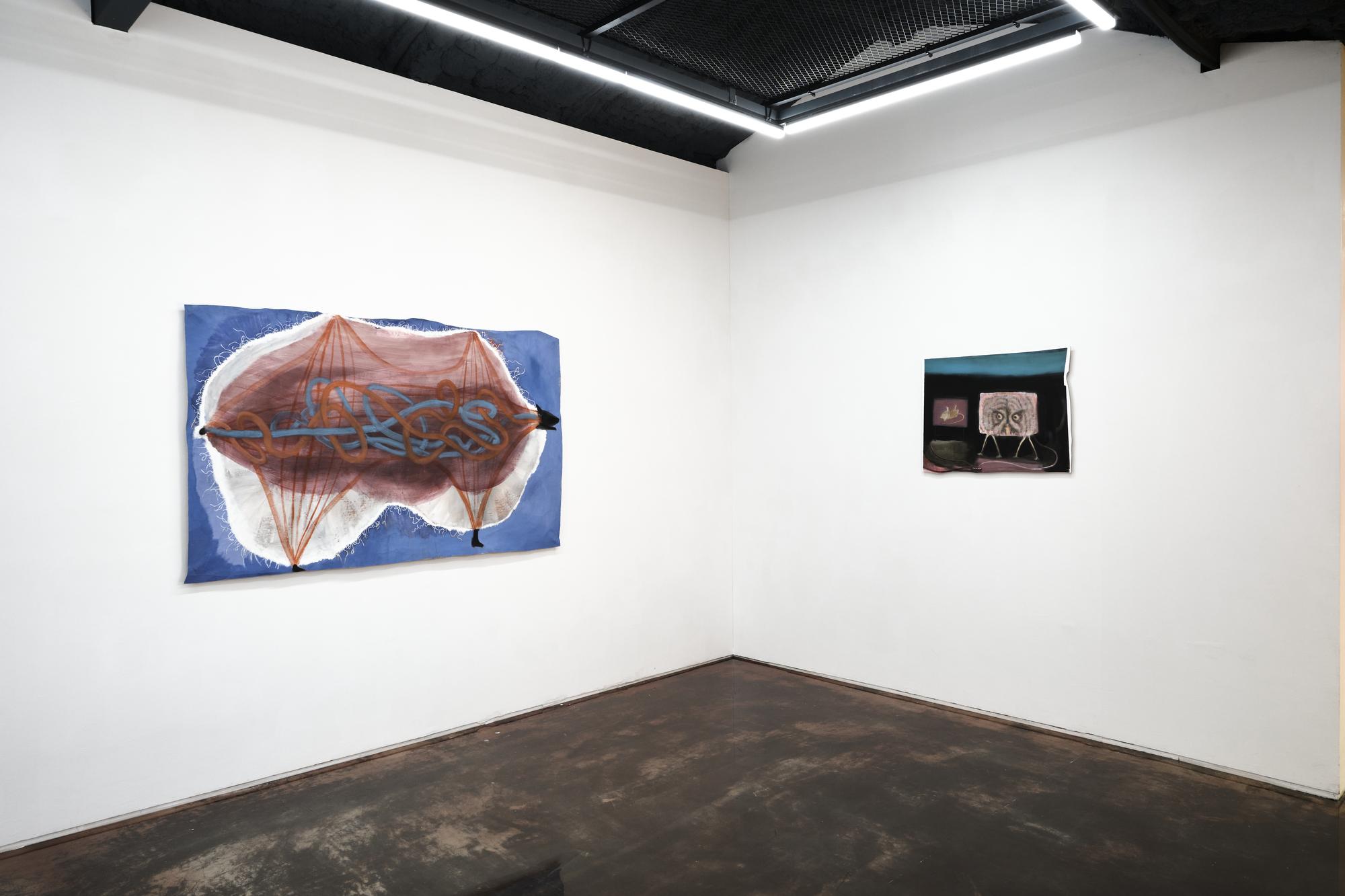 〈낭만적인 동물〉은 천이 벽에 붙어있는 상태가 이미지가 된 작업이다. 천을 벽에 고정하기 위해 몇 지점에 붙인 테이프를 중심으로 생기는 주름, 그 주름으로 인해 생기는 명암을 유심히 관찰하고 그림의 요소로 가져왔다. 벽에 간신히 붙은 얇은 평면을 보다 보니, 그 평면을 지탱해 줄 수 있는 단단한 뼈대를 욕망하게 되었고, 자연히 그리게 되었다. 그림은 점점 하나의 생명체의 모습으로 자라났다. 그림의 레이어는 가장 바깥의 피부 주름부터 내부의 기관 순으로 거꾸로 그려졌다. 나는 자신이 만들어지는 과정과 내부의 모습을 숨김없이 모두 드러내고, 그 자체로 이미지가 된 이 그림을 ‘낭만적’이라고 생각했기에 제목을 〈낭만적인 동물〉이라고 지었다. 이번 전시는 모두 이와 같은 태도로 만들어진 작업들로 꾸렸다. 전시 제목 〈로맨틱 맥시마〉도 이 같은 태도를 유지하기 위해 만든 주문이다.