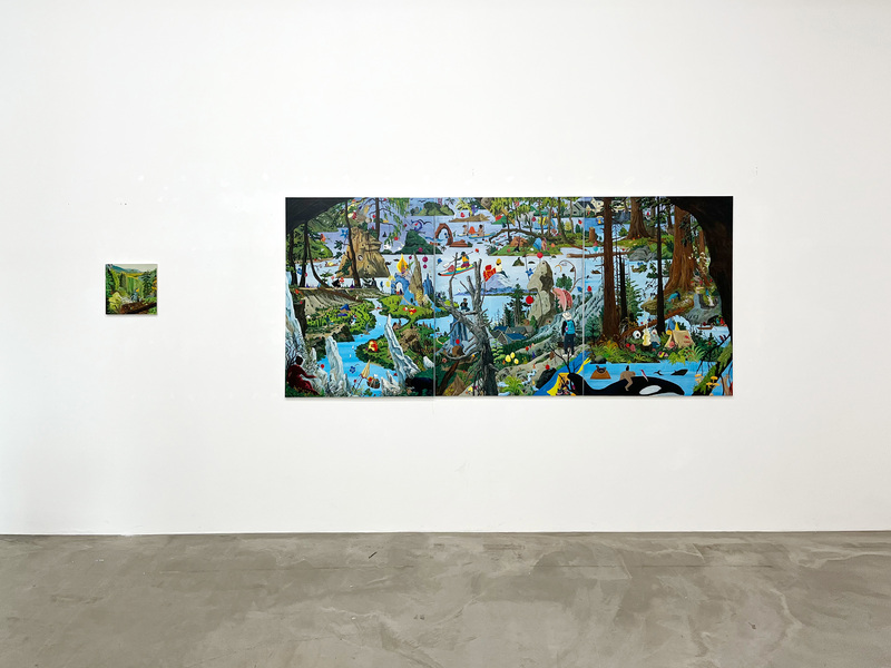 거장 히에로니무스 보쉬 (Hieronymus Bosch)와 피터 브뤼겔 대 (Pieter Bruegel)에 대한 오마주 (Homage)이자, 동양 산수화의 몽환적 이상향과 미국의 광활한 대자연을 교차시키는 회화적 실험으로 이어지며, 신화와 현실, 개인의 역사가 화면 위에서 자유롭게 뒤얽힌다.