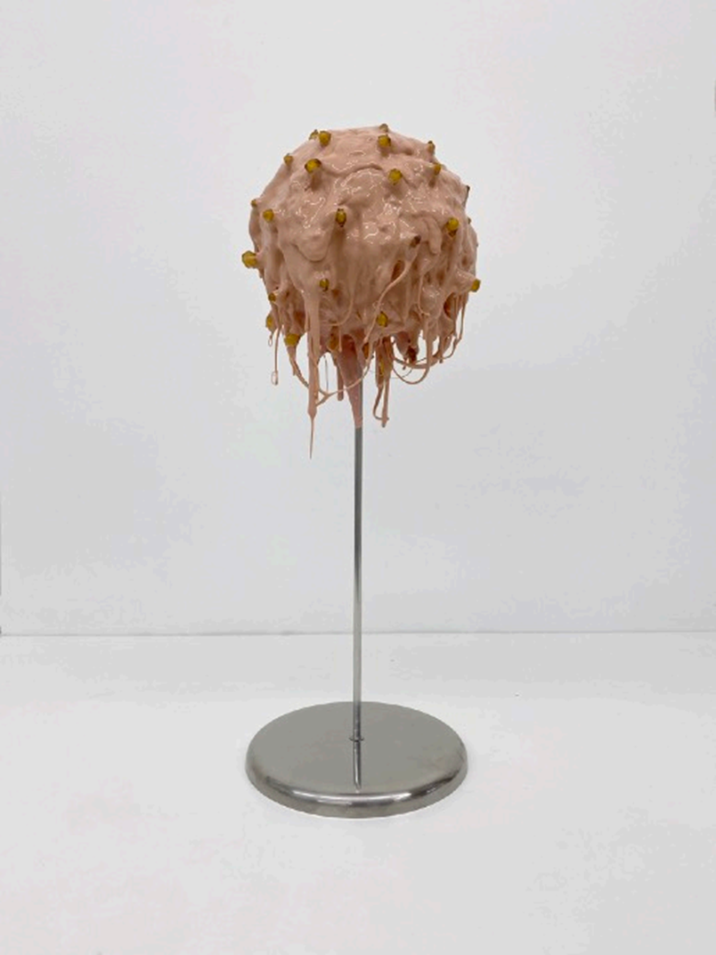 류한솔, 〈여드름〉, 2022, 라텍스, 실리콘, 면봉, 스테인리스, 38.4x15x15cm. 《스티키》 전시 전경(무목적, 2022) ©무목적