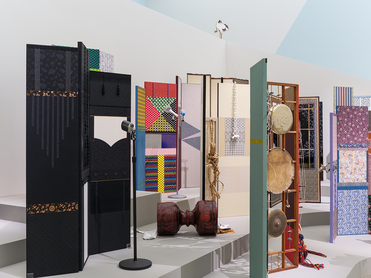 김지평은 중고로 구입한 족자와 병풍에서 그림을 뜯어내고 그 지지체를 남기고, 그 지지체에 비단, 레이스, 술, 짚 등을 덧붙여 의인화한 작업을 만든다. 이번 전시의 설치 작업 ‘다성多聲 코러스’(2023–2025) 연작은 기존의 병풍 연작에 신작을 더하고
