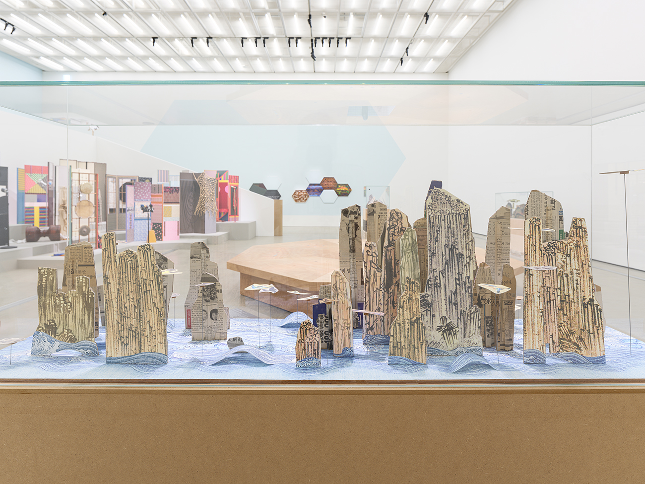 그려지기 마련인 누각을 팔각 나무 패널로 전시장에 설치하고 그 한가운데 작게 인조 돌 모형과 물을 담아 산수를 차경借景함으로써 산수화의 요건을