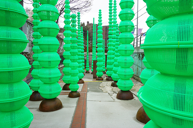 아름다움을 시각적으로 표현한다. 최소 3m에서 최대 9m 높이로 쌓인 소쿠리 탑들은 마치 거대한 자연의 모습인 양 도심 한 가운데에 펼쳐진 인공의 숲으로 일상과 예술, 자연과 인공의 경계를 허물고자 한 작가의 작품철학을 궁극적으로 보여준다.