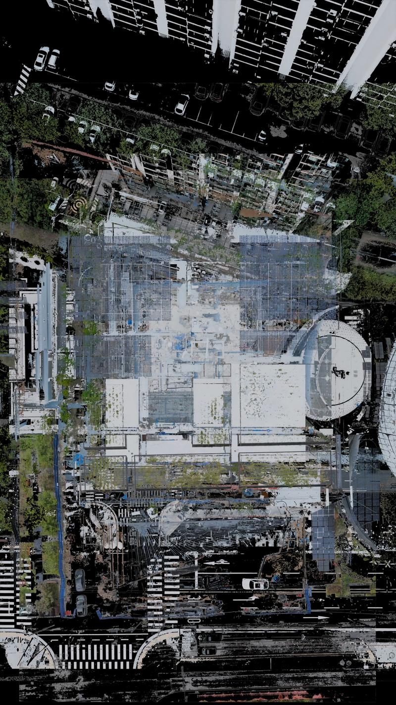 다중 노출된 실크스크린 작업은 건축 시공의 시간성과 중접 구조를 시각화하며, 1만여 장의 사진을 통해 재구성된 3D 작업은 기록의 공간적 체험에 대한 가능성을 탐구한다.