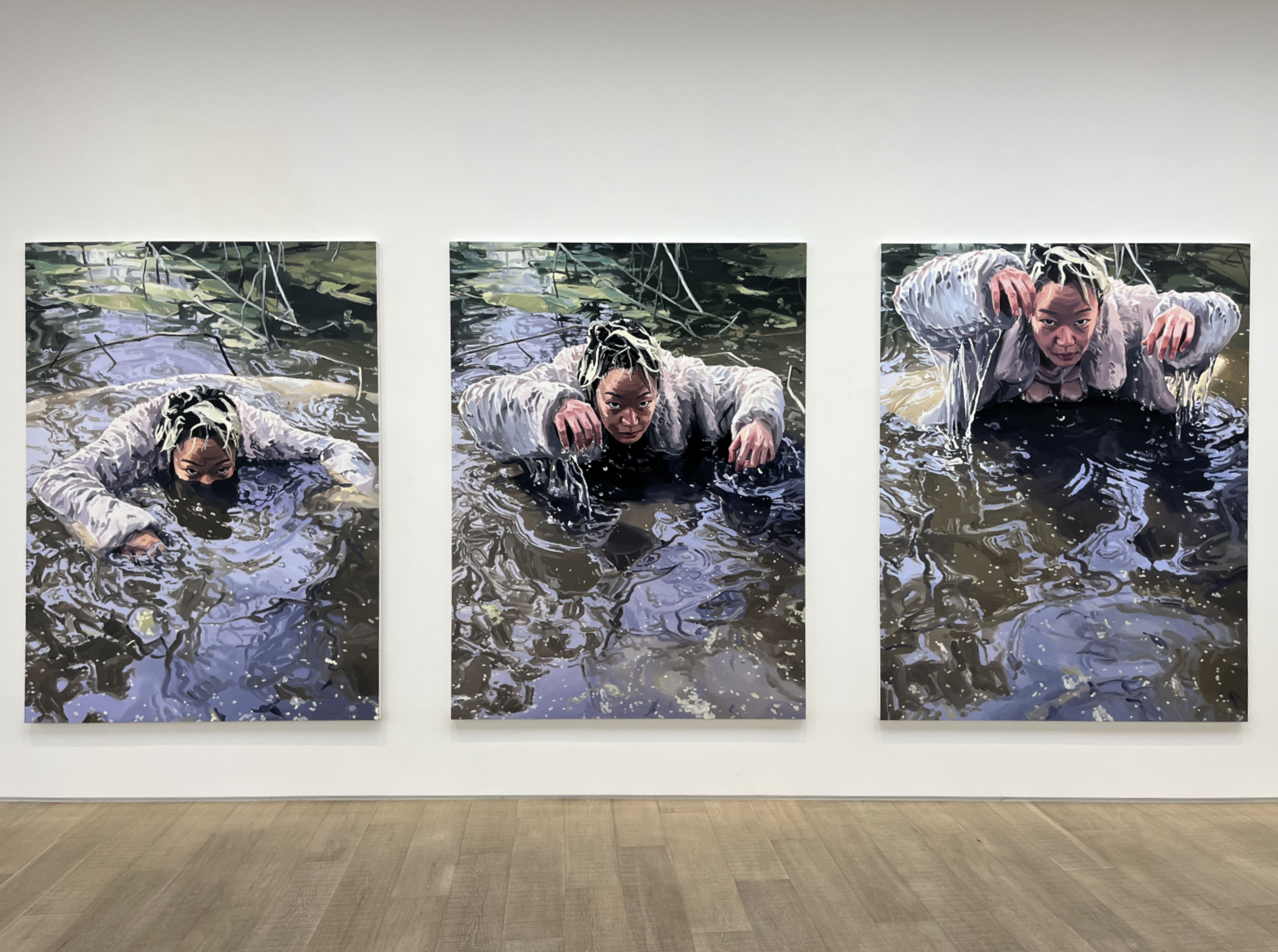 그의 회화는 인물, 물, 빛, 식물 등 다양한 요소들이 뒤섞인 환경 속에서 구성되며, 특히 물과 늪과 같은 유동적인 공간이 중요한 배경으로 작동한다. 이러한 환경은 인물의 몸과 긴밀하게 맞닿으며, 경계를 흐리는 시각적 효과를 만들어낸다. 작가는 두터운 붓질과 빠른 제스처, 점성과 밀도를 지닌 색채를 통해 물결, 반사, 흐름과 같은 감각을 물질적으로 구현한다. 이 과정에서 인물은 완결된 형태로 제시되기보다 일부가 잘리거나 중첩되고, 때로는 서로 다른 순간이 하나의 화면 안에 병치되며 파편화된 상태로 나타난다. 이는 회화가 더 이상 안정된 재현의 틀이 아니라, 감각과 사건이 교차하는 장이라는 점을 드러낸다.