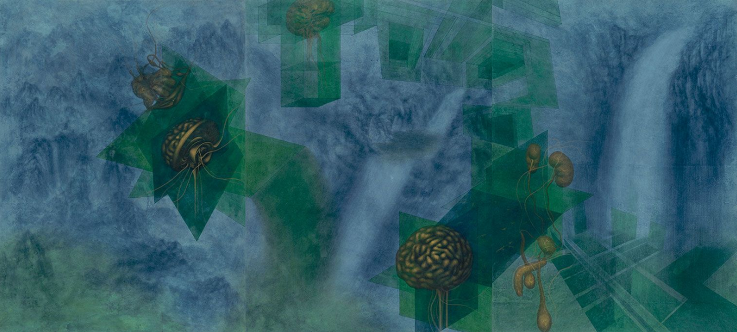 채색과 건조를 반복해 완성한 그림의 바탕은 두텁게 가라앉은 심해처럼 느껴진다. 뿌연 안개처럼 답답하고 축축한 공기 속에 은밀하고 성적인 도상들, 인간의 욕망이나 신체를 은유하는 자연물들이 모습을 드러낸다.