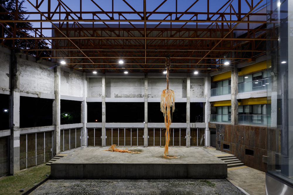 그 다음해 리옹 비엔날레에서 선보인 〈망치는 자들〉(2019)에서는 레진, 와이어, 글리세린을 활용해 조각의 표면을 이루는 재료들이 모터와 펌프의 운동 지속에 따라 조각 몸체에서 떨어져나오는 과정을 효과적으로 보여주었다.