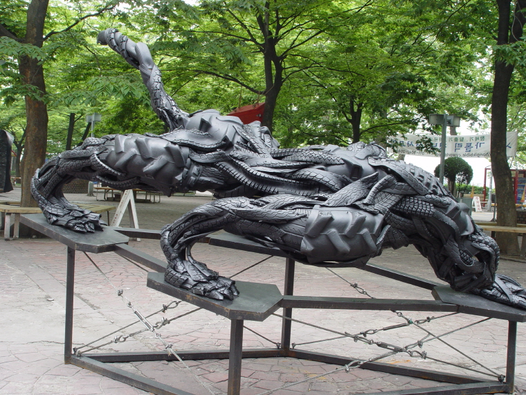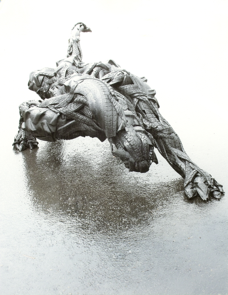 지용호의 ‘타이어 뮤턴트’는 수명이 다한 고무 타이어를 사용해 자르고 철이나 나무로 미리 제작한 틀 위에 붙여 형태를 완성한다. 이후에는 무게는 가볍고 튼튼한 강화 플라스틱을 캐스팅해 모형을 만든다.