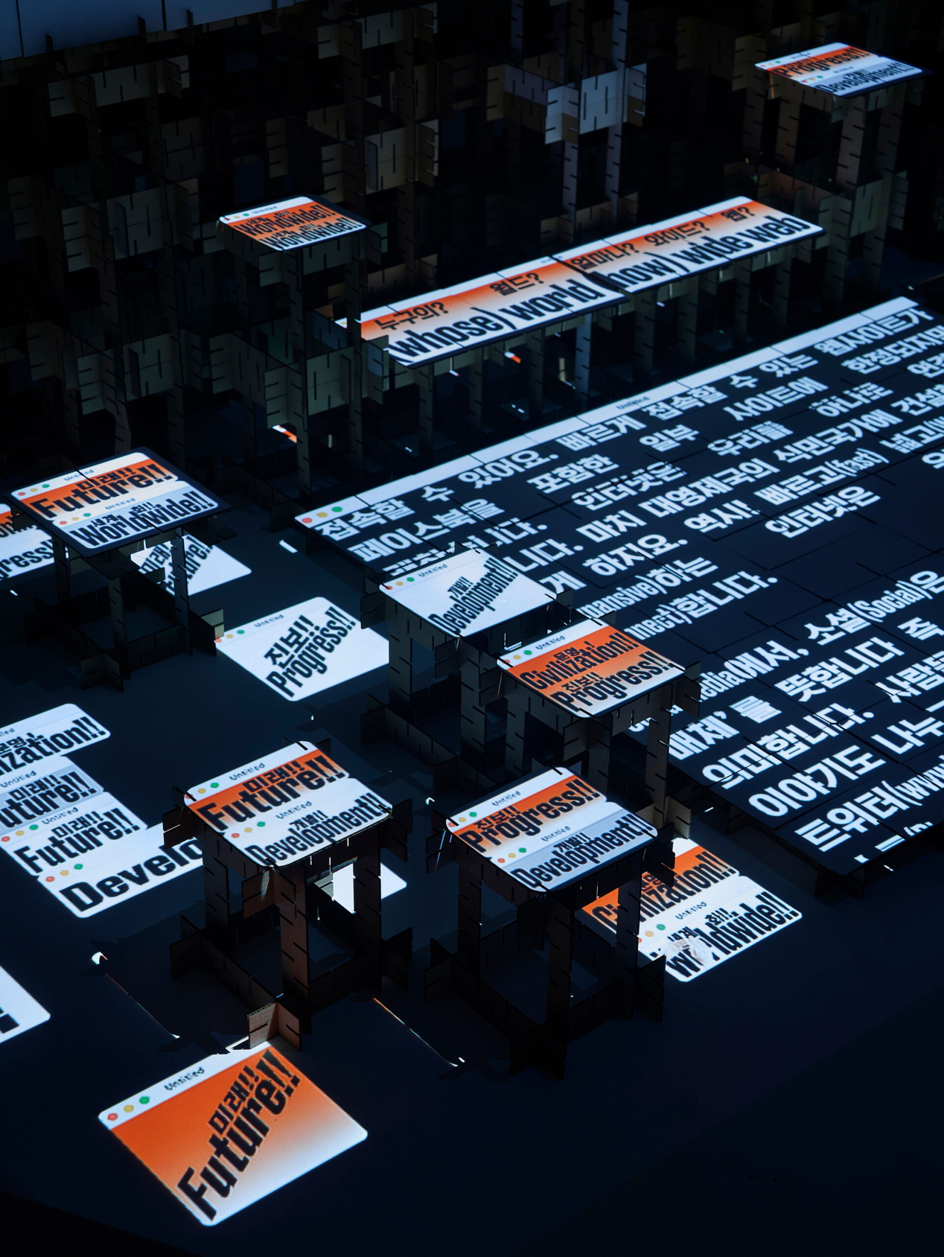 이후 아르코미술관에서 선보인 〈woldeu waideu〉(2022)에서는 웹이 만들어내는 통합적 네트워크가 실질적으로는 사용자마다 다른 조건과 환경 속에서 작동함을 시각화한다. 폼보드에 투사된 서로 다른 압축률의 영상들은 웹이 표면적으로는 글로벌한 통합을 약속하지만, 실제로는 불균형과 정보 격차를 강화하고 있음을 드러낸다. 이러한 문제의식은 인터넷 환경을 지배하는 알고리즘 권력의 구조적 편향성으로 확장된다.