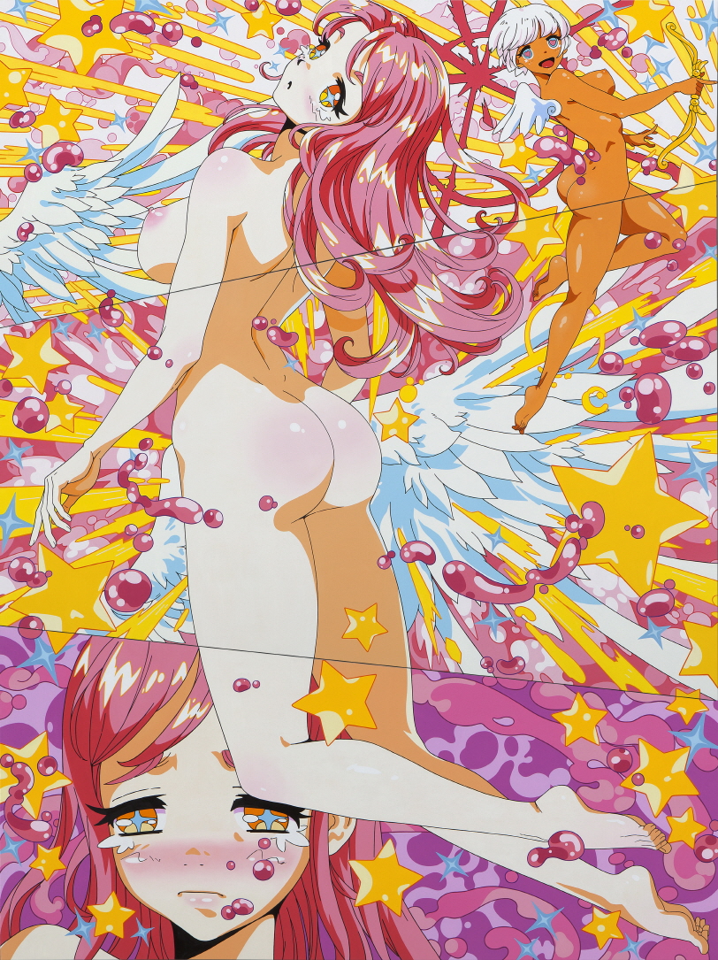 이윤성의 회화는 화려한 색상과 문양이 휘몰아치는 배경, 귀엽고 환희에 찬 표정의 모에화(모에카[萌え化])된 나신의 미소녀 캐릭터로 관객의 시선을 단박에 사로잡는다.
