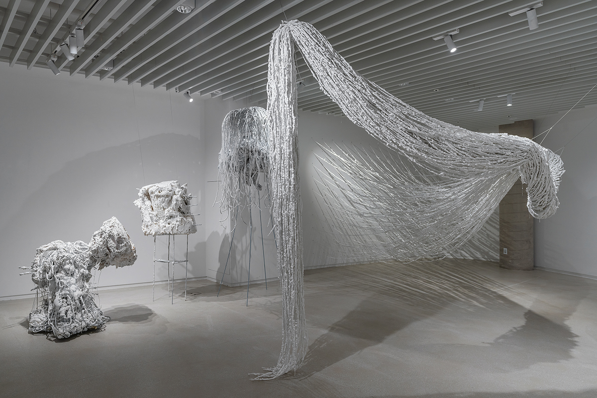 2020년대 초반에는 익숙함을 해체해 낯설게 만드는 전략이 명확해진다. 〈현대기록 시리즈: 탐과 기둥-힘〉(2020)처럼 테이프·철사·케이블 타이 등 일상 소모품을 비정형 덩어리로 전도해 시각·촉각을 동시에 자극하는 질감을 구축한다. 이때 낯섦은 대상의 의미를 비우는 제스처가 아니라, 도시 환경이 품은 잠재적 긴장을 ‘감각의 사건’으로 호출하는 장치로 기능한다.