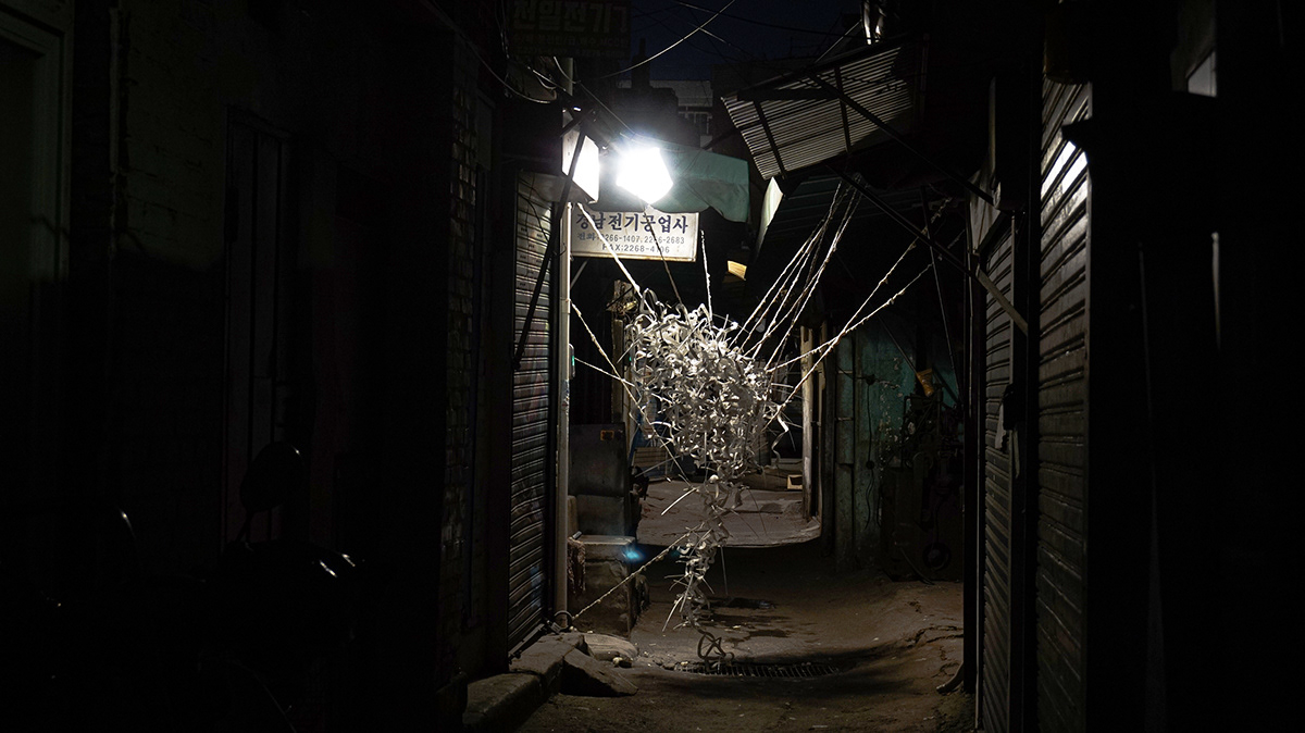 2020년대 초반에는 익숙함을 해체해 낯설게 만드는 전략이 명확해진다. 〈현대기록 시리즈: 탐과 기둥-힘〉(2020)처럼 테이프·철사·케이블 타이 등 일상 소모품을 비정형 덩어리로 전도해 시각·촉각을 동시에 자극하는 질감을 구축한다. 이때 낯섦은 대상의 의미를 비우는 제스처가 아니라, 도시 환경이 품은 잠재적 긴장을 ‘감각의 사건’으로 호출하는 장치로 기능한다.