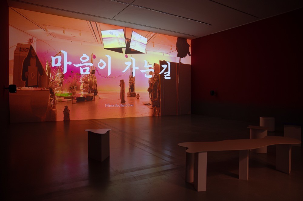 《마음이 가는 길》(두산갤러리, 2020)는 ‘게시’와 ‘갱신’이라는 두 축으로 집단 정념을 해부한다. 〈게시계시개시〉(2020)와 〈호러 에로 천박 주문〉(2020)은 광고·경고·구호가 낳는 감각의 피로와 각성의 상충을 다성적 사운드와 영상으로 체현하고, 전시장에 흩어진 파편은 ‘척추동물’로 갱신되어 자라남으로써 잔여가 생물학적 은유로 전환되는 순간을 포착한다. 〈마음이 가는 길〉(2021)의 ‘할머니’들은 빠른 갱신의 사이클에서 탈락·유예된 감정 찌꺼기의 의인화로, ‘끝없이 다시 고쳐 새로이 내보이는’ 사회에서 마음의 방향을 묻는다.
