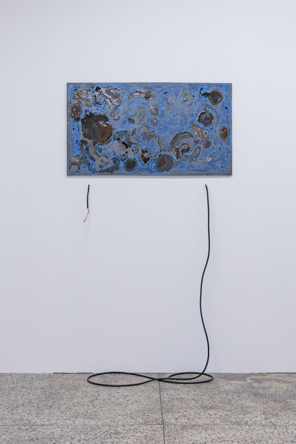 〈3성TV은하46” (배경 음악: 비트코인과 블랙홀)〉은 가열·산화·결정화라는 도자 공정을 스크린-오브제화하여, 콘텐츠가 아닌 ‘표면을 만드는 시간’을 전면화한다. 금속 산화물·동전·전선의 잔여 물질성은 데이터-광물-자본의 교차를 표피에 새기고, 배경 음악의 실시간 변주 스트리밍은 전시장을 넘어 네트워크 상에서 ‘감각의 게시/갱신’이 계속된다는 것을 형식적으로 보증한다.