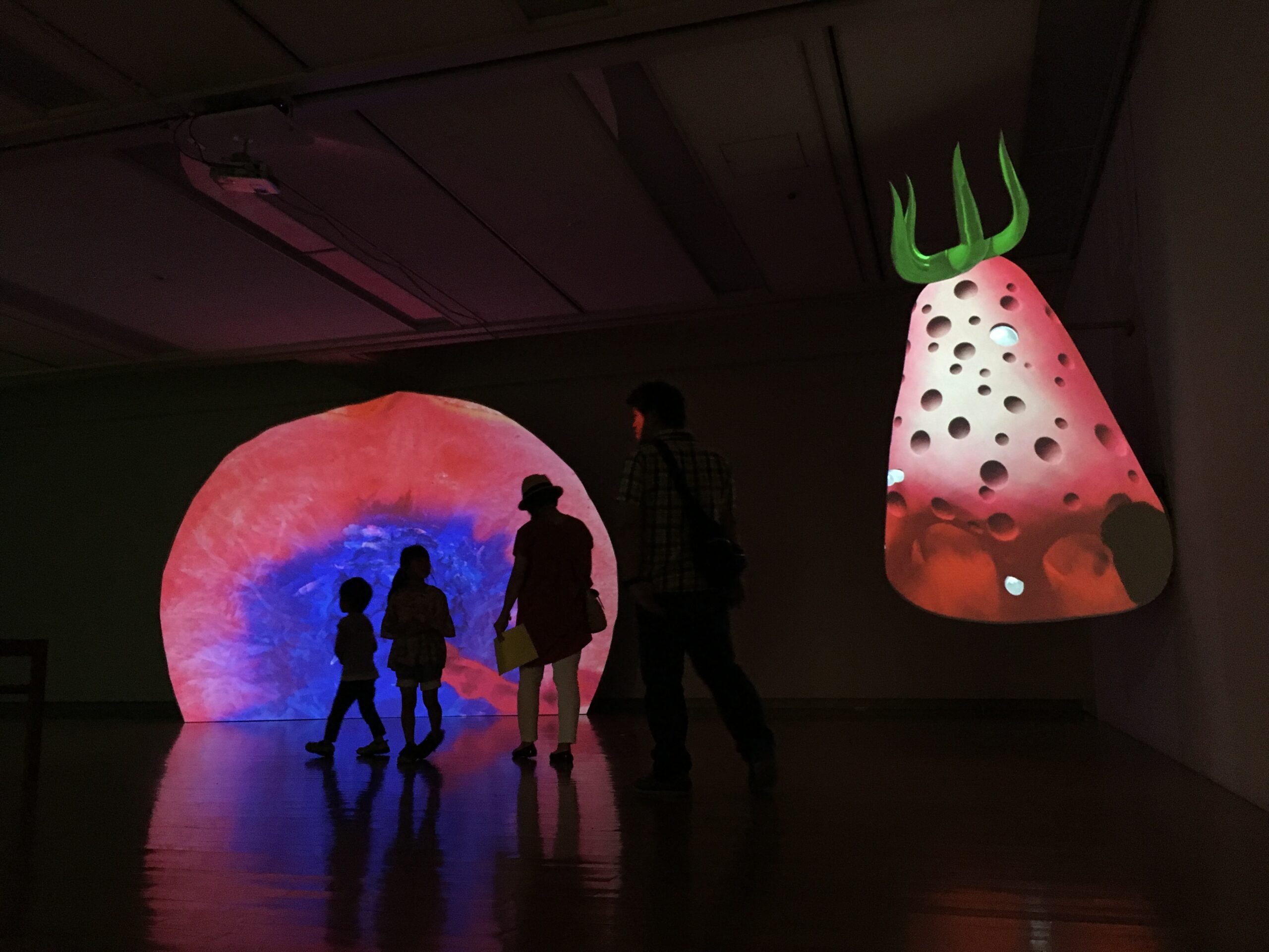 〈얄루 성터, 상상 고고학〉은 유적 공간(후쿠오카성)의 시퀀스를 활용한 현장 특정적 형식이다. 방-통로-방의 동선에 비디오 맵핑 조형을 배치하고, 마지막은 VR로 ‘가상 유적’에 입장시키는 구조를 취한다. 관객의 이동이 ‘개인 서사→공동 서사→가상 아카이브’로 겹겹이 변환되는 편집 장치가 된다.