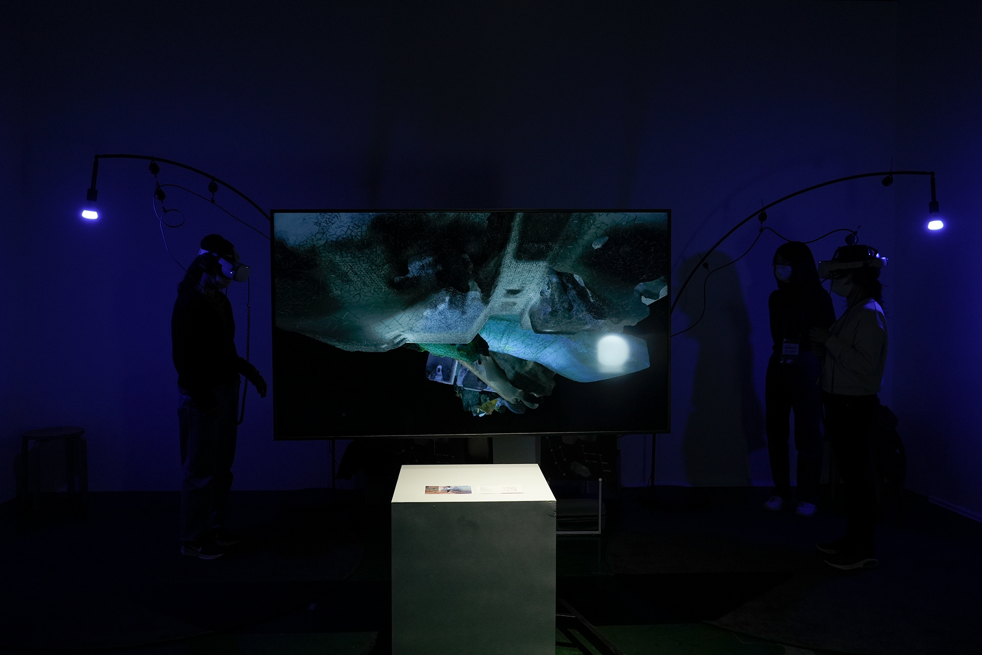 〈Worlding···〉은 핸드 트래킹을 도입해 신체-제스처를 주된 입력으로 삼고, 결과 데이터를 종이 출력·바닥 지형·스크린 영상으로 실물화한다. 네트워크는 동기화가 아니라 “지연·누적”의 프로토콜로 쓰이며, 디지털 행위가 전시장 물질성에 퇴적되는 구조를 만든다.