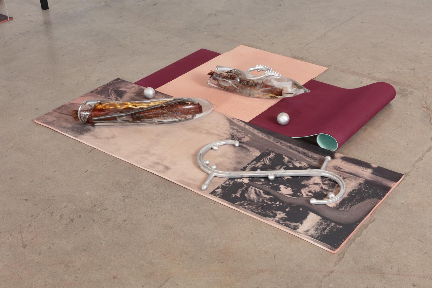 블로운 글라스, 젤 왁스, 느릅나무 껍질, 황기 뿌리, 철사, 시모스(sea moss), 스프링, 실(thread), 코드(cord), 튜브, 알루미늄, 염색된 요가 매트 위 UV 프린트