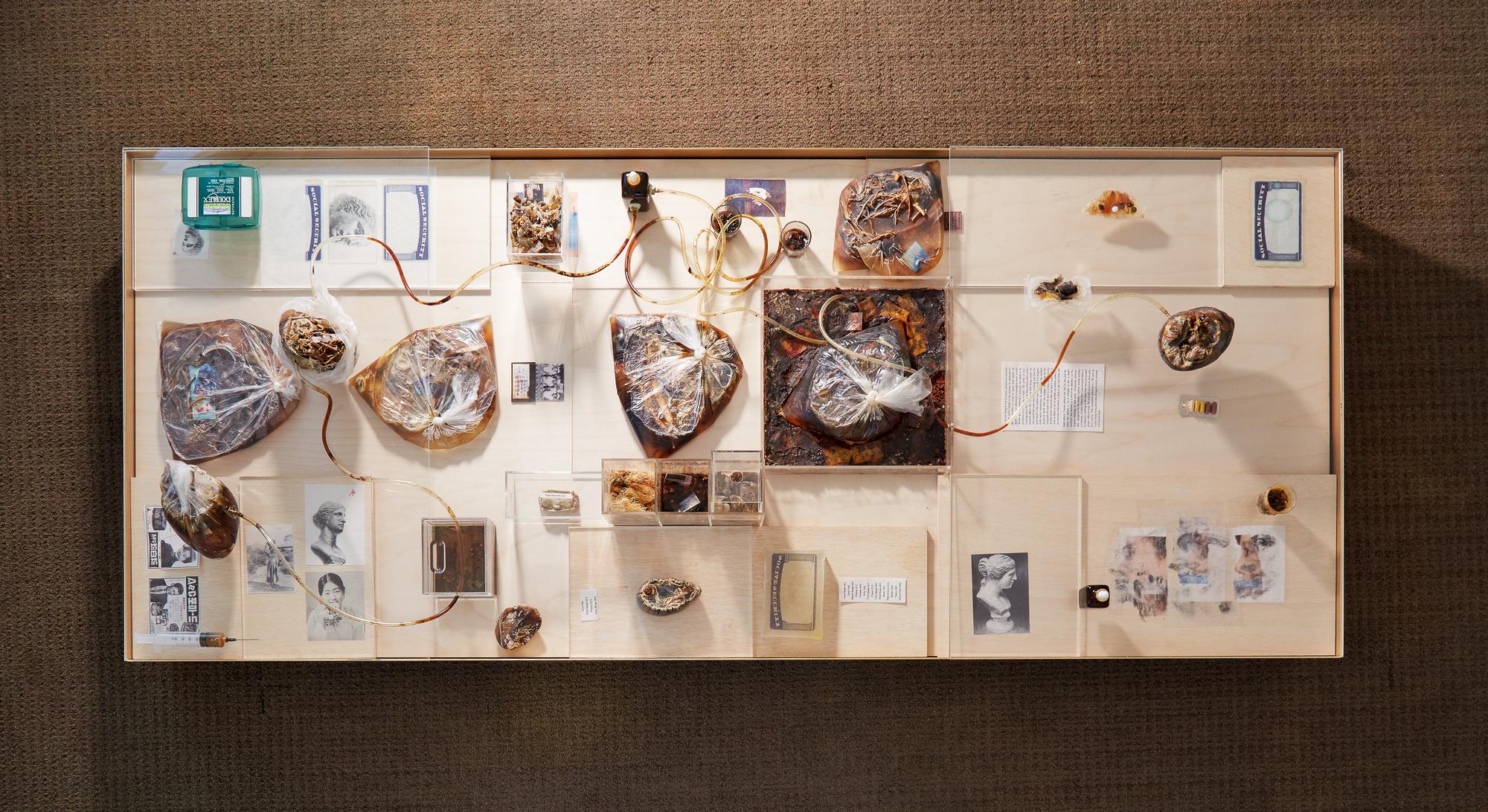 〈The Birth of Venus〉에서는 화장품·오일·약초·약물·각질 제거 마스크·향수 샘플 등 신체를 관리하는 제품들이 주요 재료로 등장한다. 여기에 수잔 손탁과 샹탈 애커만의 텍스트가 결합되며, 신체·질병·죽음이 어떻게 은유화되고 상품화되는지 드러낸다. 이 시기 작업은 ‘신체 관리’의 미학과 폭력성을 재료 자체의 성질(향, 점도, 질감, 기능성)을 통해 구현한다.