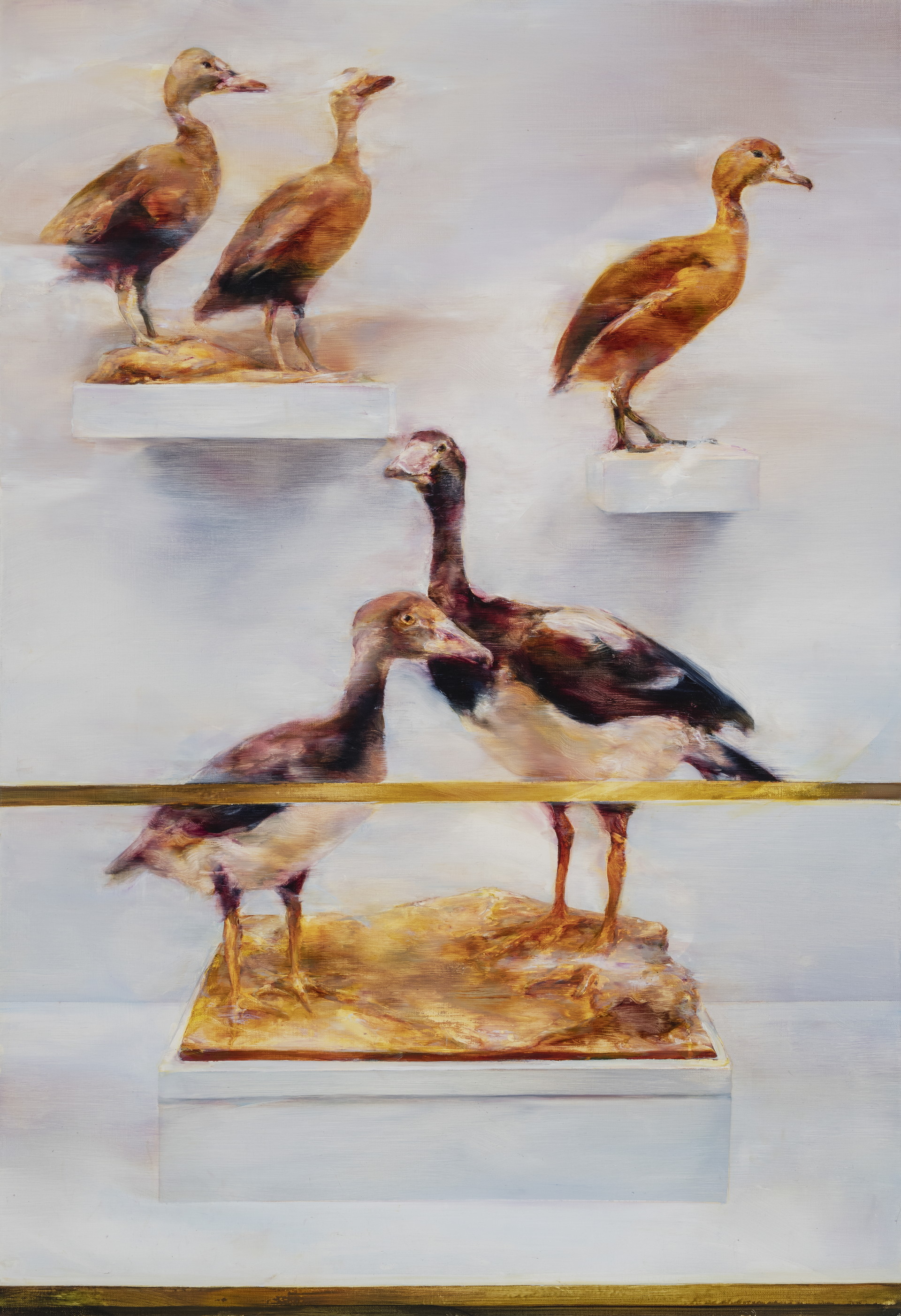 2022년 개인전 《진품실(Cabinet of Curiosity)》(이유진갤러리)에서는 이러한 관심이 ‘소유의 욕망’으로 확장된다. 박제된 동물 표본은 살아 있는 생명체를 보존하려는 것 같지만, 실제로는 죽음을 전제로 한 소유의 행위이다. 작품 〈Stuffed Antelopes〉(2022)나 〈Stuffed Chamois and Wild Sheep〉(2021~2022)에는 살아 있음과 죽어 있음, 자연과 인공의 경계가 뒤섞인 상태가 존재한다. 작가는 박제된 생명체를 통해 우리가 자연을 구조화하고 재배열하는 방식, 그리고 그 과정에서 발생하는 모순적 감정들을 회화적으로 사유하게 한다.