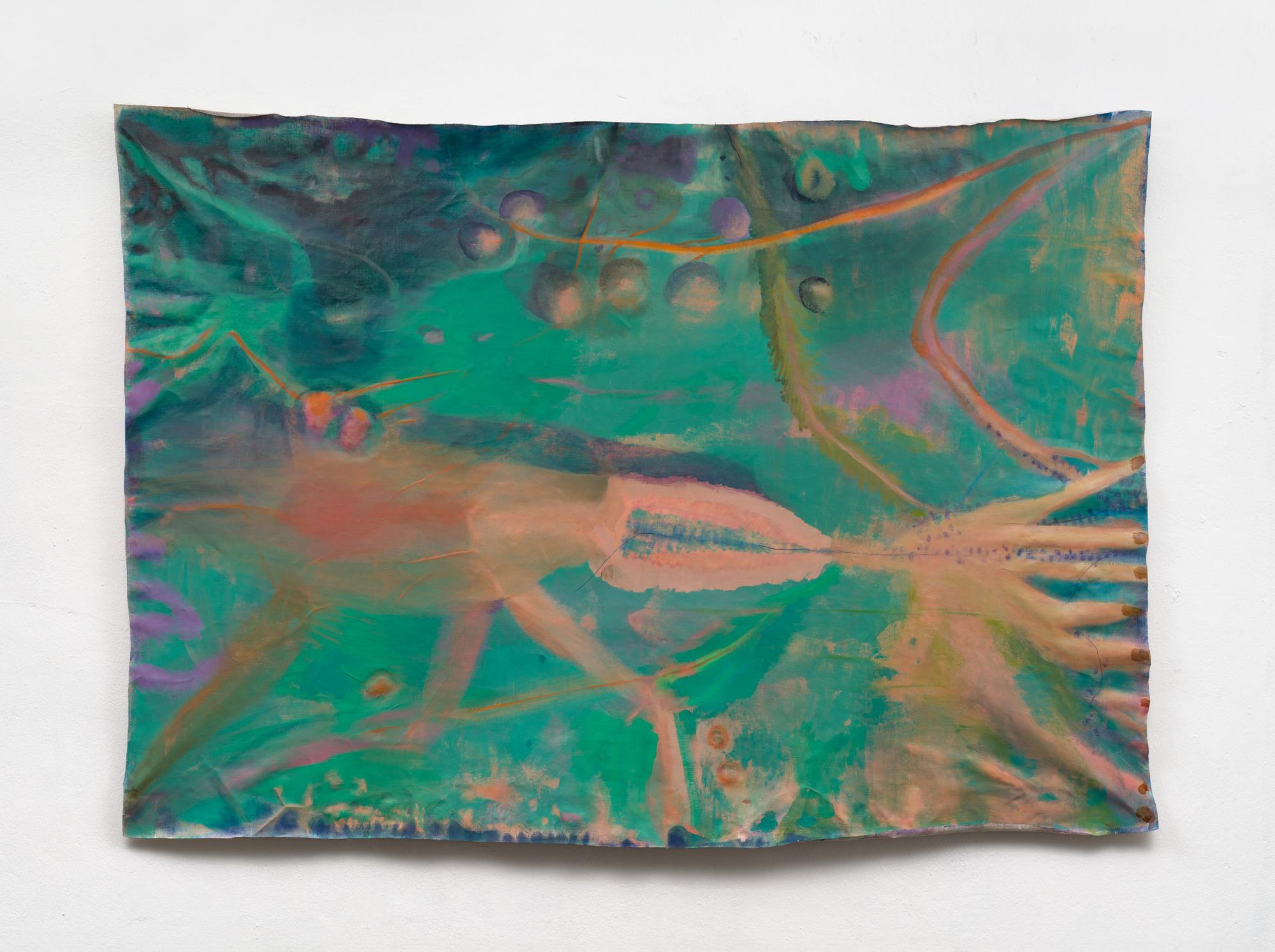 이 흐름은 《매달린 그림》(에이라운지 컨템포러리, 2025)에서 극대화된다. 캔버스는 단단히 고정되지 않고 강선에 의해 당겨진 채 중력과 온도, 마찰에 반응한다. 천의 말림, 테이프의 이탈, 처짐은 우연이 아니라 회화의 일부가 된다. 〈악몽을 꾸고 있는 그림〉(2025)과 같은 작업에서 회화는 하나의 ‘몸’으로 경험된다. 회화는 더 이상 벽에 걸린 평면이 아니라, 환경과 상호작용하는 유연한 신체다.