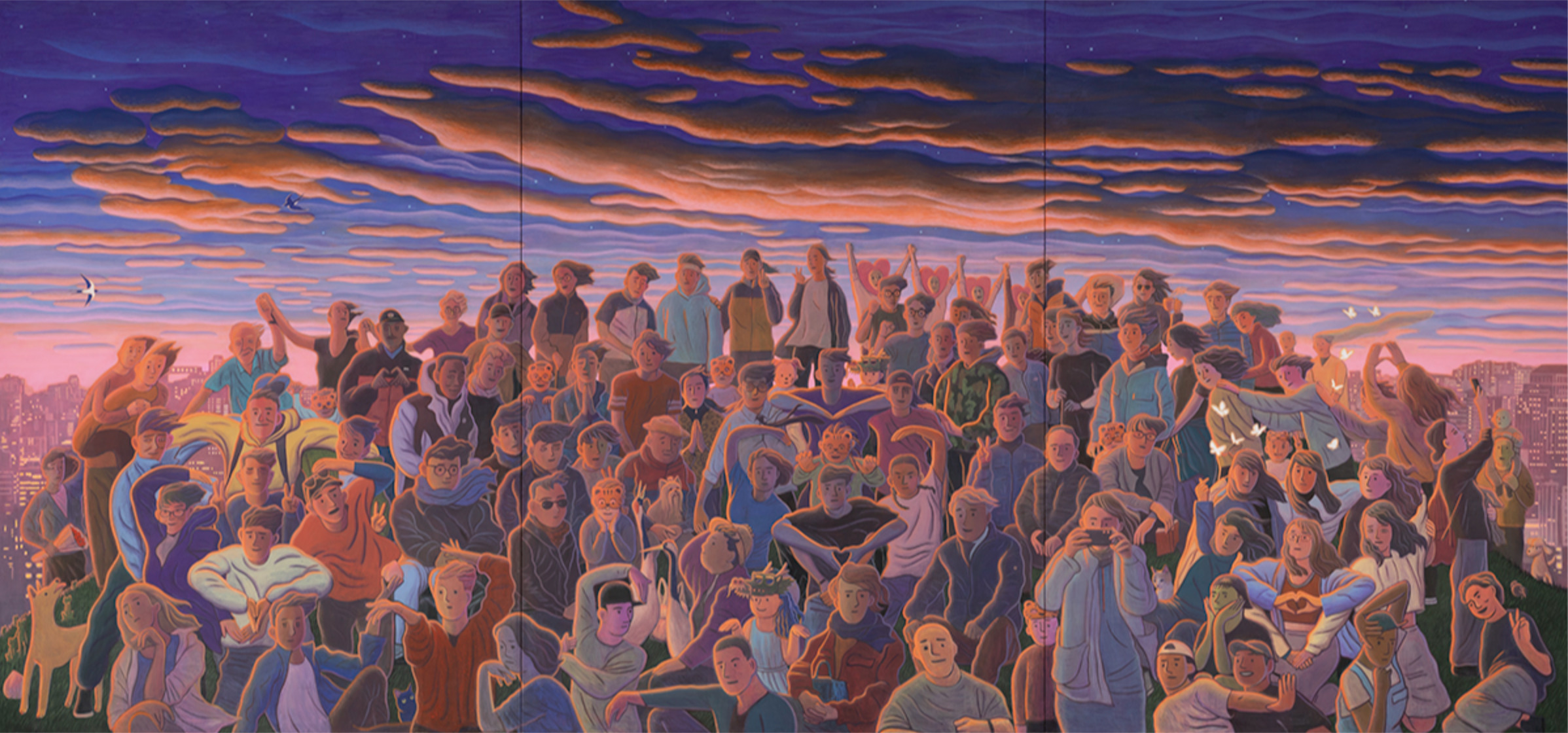 개인적이면서도 보편적인 서사를 강조하는 방향은 최근 작업에서도 두드러진다. 300호에 육박하는 캔버스 3개를 결합한 대형 회화 〈해 질 녘, 산에 올라서서〉(2024)에서는 다양한 인물, 동물 등 세상의 존재들이 하나의 군중을 이루는 모습을 그리고 있는데, 이는 그의 작업이 개별적 삶의 정서를 초월하여 집단적 서사를 구성하고, 부조리한 현실 속에서도 개개인의 다양성과 연대감을 소망하는 방식을 보여준다.