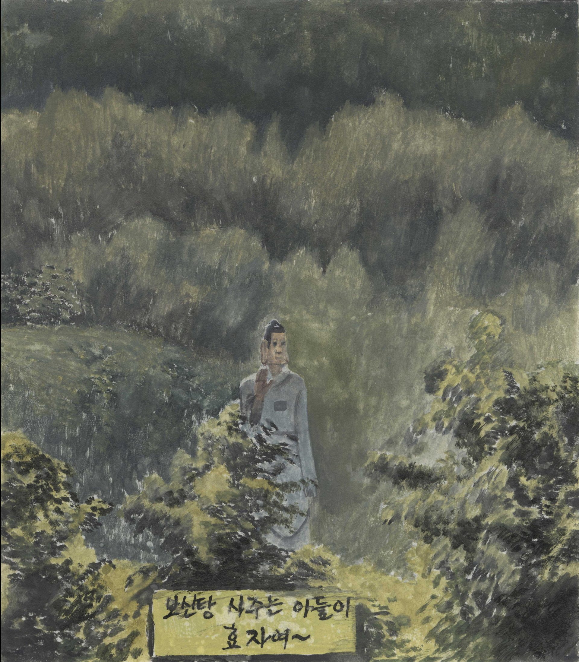 박노완의 작업은 회화를 중심으로 하지만, 그 표현 방식은 회화의 전통적인 재현 방식을 끊임없이 전복하는 방식으로 전개된다. 그는 대상을 선명히 묘사하기보다는 문지르고 덧칠하고 녹이는 행위를 반복함으로써, 각 재료들의 물성을 중첩시켜 독특한 물리적 흔적이 담긴 회화적 표면을 생성한다. 수채, 아라비아 고무, 에탄올 등 다양한 재료를 혼합해 만든 얼룩진 화면은 작품 〈큰 수건〉(2022)이나 ‘교회 전단지 부분’(2022) 연작 등에서 명확히 드러나는데, 이는 ‘얼룩’처럼 스며든 감정이나 저급한 존재들의 현실과 이상적 욕망 간의 괴리를 효과적으로 시각화한다.