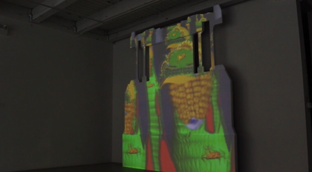 〈얄루 성터, 상상 고고학〉은 유적 공간(후쿠오카성)의 시퀀스를 활용한 현장 특정적 형식이다. 방-통로-방의 동선에 비디오 맵핑 조형을 배치하고, 마지막은 VR로 ‘가상 유적’에 입장시키는 구조를 취한다. 관객의 이동이 ‘개인 서사→공동 서사→가상 아카이브’로 겹겹이 변환되는 편집 장치가 된다.