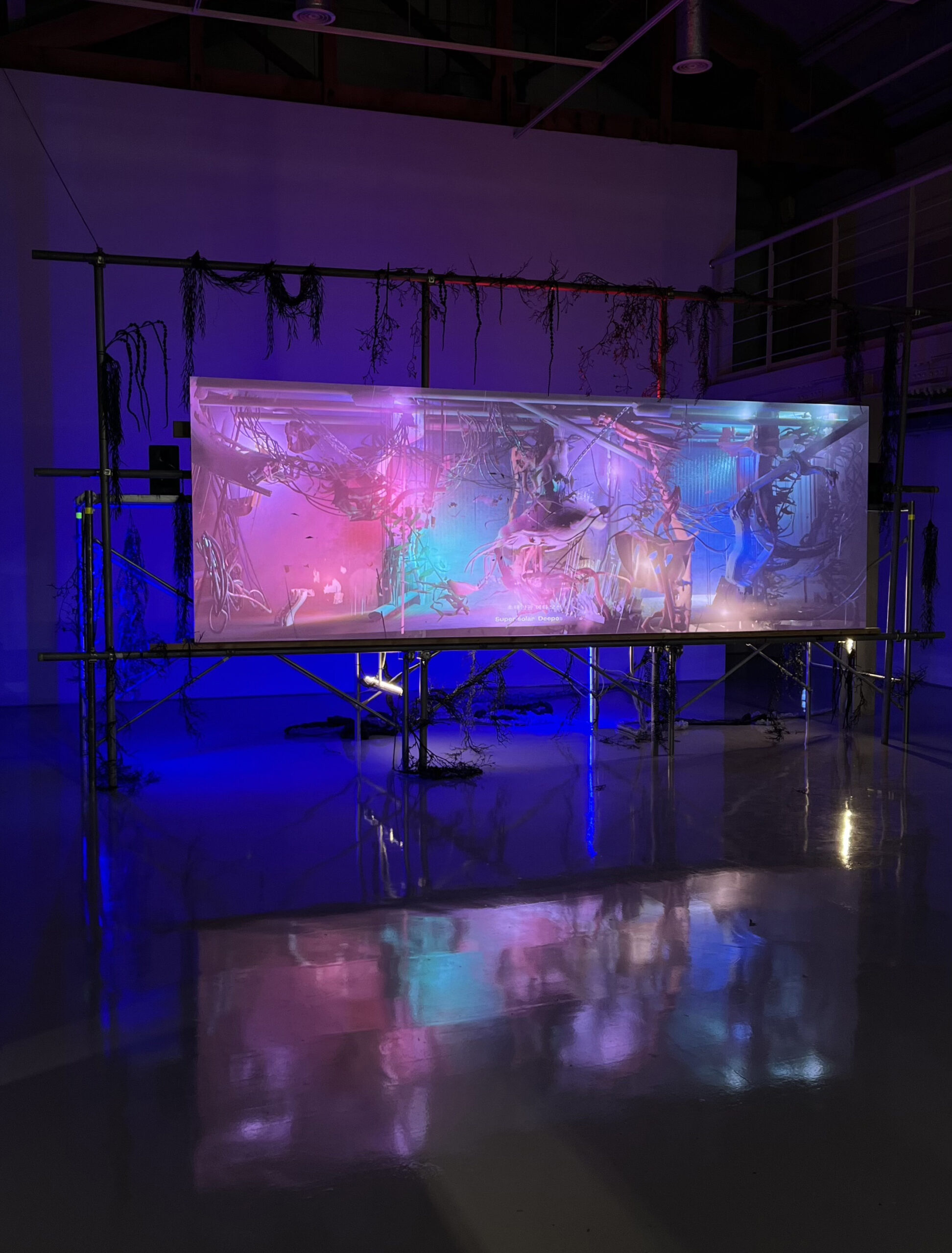 《호모 폴리넬라 더 랩: 짜라투스투라여, 슬퍼하지 말아요》에서는 3채널 비디오, 모션·VR, 프로젝션 맵핑, 디지털 프린팅 등을 ‘연구소’의 표면으로 통합한다. 국립수산과학원 해조류센터와의 협업은 시각언어에 과학적 근거를 부여하고, 광합성 신체·불필요해진 기관 같은 설정은 SF 서사를 구체적 신체성으로 번역한다. 세계관 구축(worldbuilding)과 증거 제시(display)의 균형이 이 시기 형식의 핵심이다.