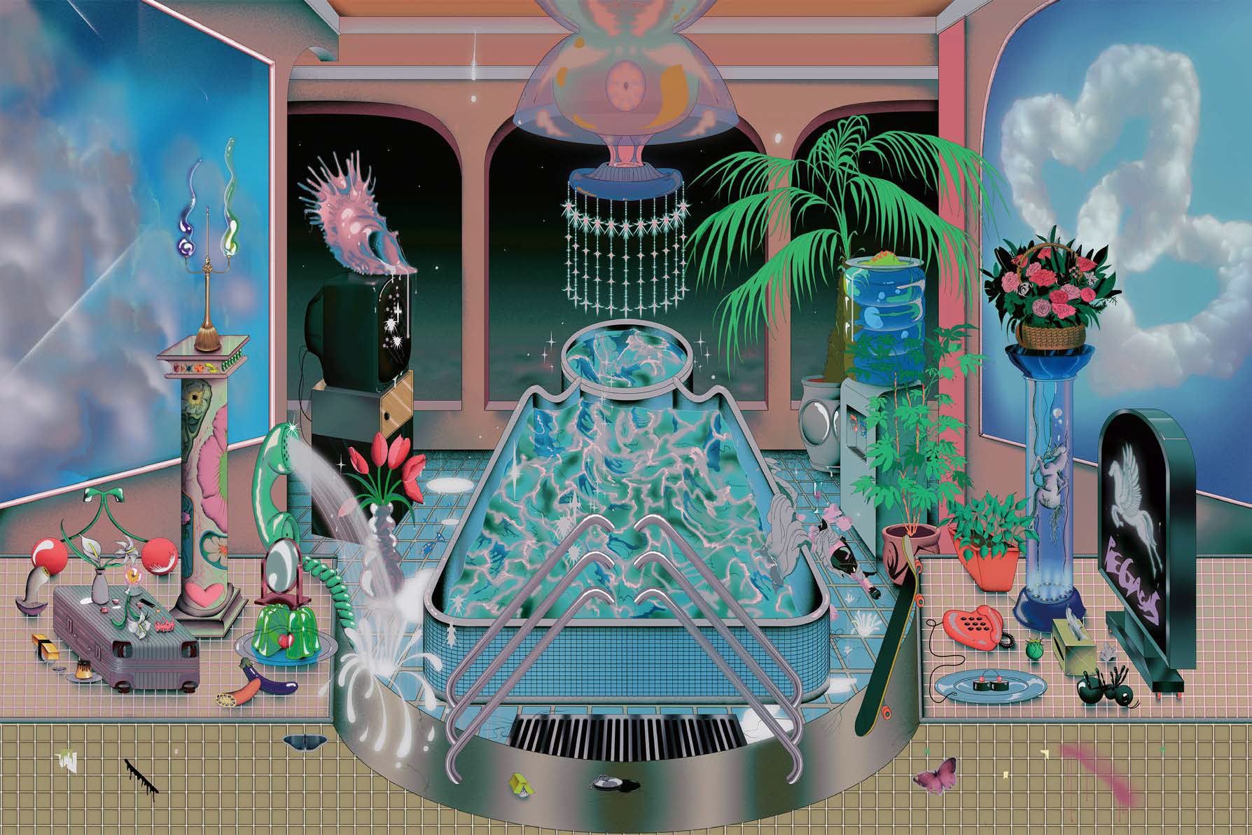색감으로 묘사된 이것은 시티팝이 흘러나오는 도시의 네온사인을 연상케 한다. 그 인공적 불빛에는 기형의